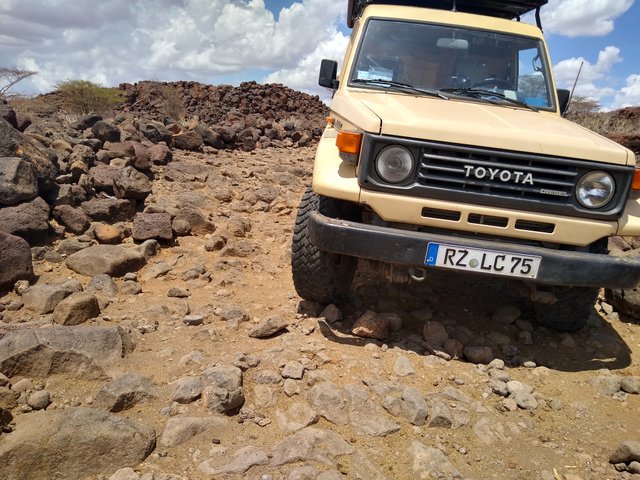 Direkt hinter Marsabit beginnt die Chabli Wüste. Die Landschaft erinnerte uns sofort an Marokko und wir genossen 2 Tage herrliche Einsamkeit bis zum Turkana See. Die Temperaturen waren auch entsprechend (tagsüber weit über 40 Grad) und das Thermometer fiel auch nachts nicht unter 30 Grad, dazu ein nächtlicher Wüstenwind, der uns den Schlaf raubte. Aber diese Einsamkeit und Möglichkeit des wilden Campen haben wir seit Namibia nicht wieder gefunden und genießen es sehr.